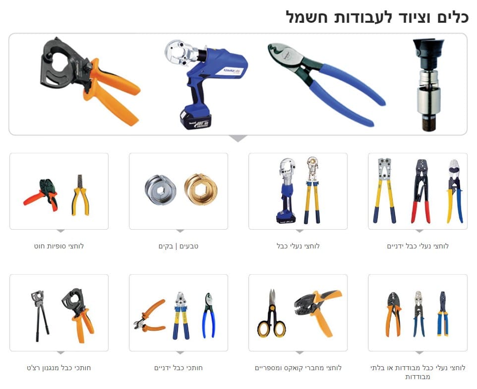 אז הנה רשימה חלקית של ציוד חשמל לחשמלאים, ציוד שצריך להיות בטוח ואיכותי. זה יכול להיות ציוד בקרה והתראה, ציוד שעוקב אחר הפעילות החשמלית ומתריע כשיש צורך בכך בשביל הבטיחות ובשביל שניתן יהיה להתגבר על התקלה במהירות, יש לוחות חשמל ואביזרים ללוחות חשמל על מנת שיהיה מקום אחד אליו מתנקזת מערכת החשמל של המבנה, יש קופסאות חשמל, יש שקעים ומפצלים, יש אביזרי חשמל לתעשייה ויש כבלים וחוטים, צנרות חשמל ותעלות לחשמל. רשימת ציוד החשמל קצרה מלהכיל את כל מה שחשמלאי יכול וצריך לעבוד איתו, כי יש סוגים שונים של עבודות ובהיקפים שונים וכל סוג של עבודה מצריך סוג אחר של ציוד וכלים.